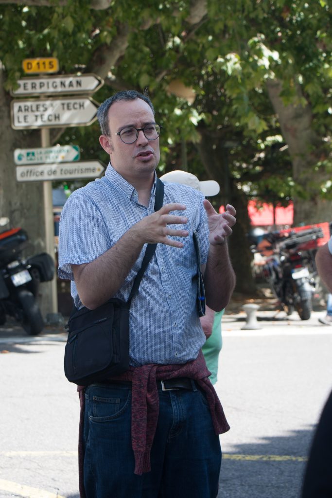 Cap als volts del migdia, Josep Coma va realitzar una petita visita guiada per Prats de Molló, tot explicant els orígens i creixement de la vila al voltant del riu Tec. El recorregut va començar al firal, fora muralles, per després recórrer els carrers de la vila antiga fins a l’església de Santes Justa i Rufina (982). Prats fou una vila que cresqué a partir d’una colònia monàstica agrícola, amb l’objectiu de repoblar l’alta vall del Tec durant el segles IX i X. La protecció reial, la possibilitat de fer mercat i la confecció de draps van marcar el ritme d’aquesta vila, que al segle XIV construeix les seves muralles. Des de l’església es va poder observar el castell o fort de la Guàrdia (1682), obra de Vauban per ordre de Lluís XIV, a fi de fortificar la frontera francoespanyola. El recorregut va continuar pel barri de la Vila d’Amunt fins al Portal de la Cavalleria, per on es va sortir de la vila emmurallada. Aquí es va creuar el pont sobre el riu Tec i es van explicar els fets de la retirada de 1939, quan més de 100.000 persones van arribar fugint de la guerra civil espanyola, així com els efectes de l’aiguat de 1940 i el fenomen del termalisme. De camí cap al punt d’origen de la visita es van comentar diferents aspectes d’actualitat sobre l’accés a l’habitatge, les possibilitats laborals en una vila de l’Alt Vallespir o les dinàmiques demogràfiques més recents.