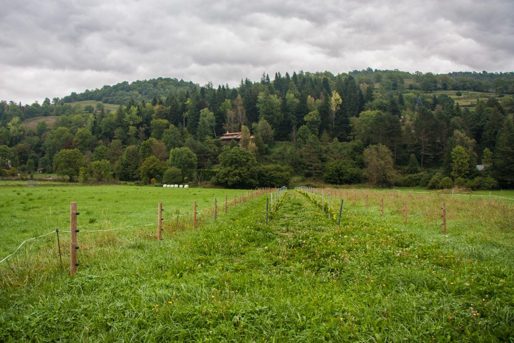 La primera parada del diumenge fou a Llanars, als afores del nucli urbà, en una parcel·la experimental on s’ha plantat vinya en el marc del projecte “Valls Circulars”. Per iniciativa de la Mancomunitat de la Vall de Camprodon i la Fundació Comunitària de la Vall de Camprodon s’ha tirat endavant aquest projecte, finançat pels fons europeus Next Generation, que pretén millorar la resiliència de les explotacions agràries davant el canvi climàtic i fomentar un model econòmic més sostenible. Núria Simón, presidenta de l’Associació de la Pagesia de la Vall de Camprodon, i Guillem Pastoret, assessor del projecte, expliquen les accions que es preveu dur a terme durant aquest projecte, sobretot el cultiu de forma experimental a diferents parcel·les cedides per propietaris de nous cultius com ara la vinya, diferents varietats de blat o patata, horta, fruits vermells, lleguminoses, pomeres… Es pretén per una banda provar noves varietats que poden ser més resilients al canvi climàtic, i de l’altra, recuperar cultius abandonats a la vall o varietats que actualment tenen més demanda. Després d’aquesta visita, el grup es va traslladar al magatzem d’estella, al veïnat de Feitús de Llanars, a cobert de la pluja insistent durant aquella estona, per parlar sobre les problemàtiques del sector agrícola i ramader a la vall, així com del sector forestal i del bosc, que cada vegada ocupa major superfície, provocant un retorcés de les pastures i els prats de dall, que havien configurat el paisatge tipus en aquesta vall pirinenca.